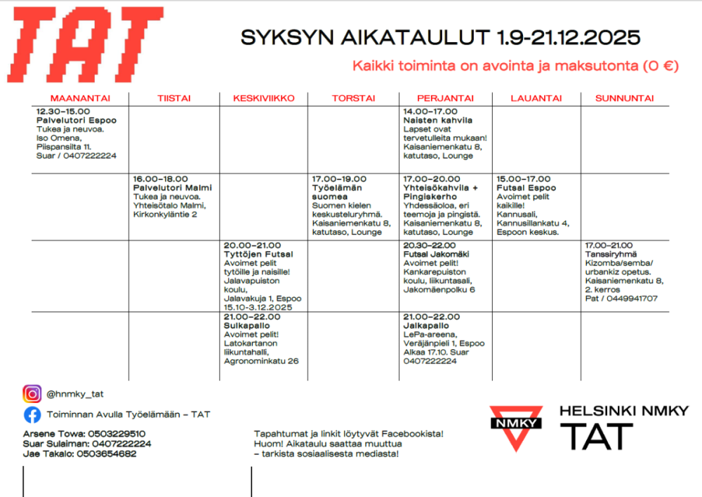 Haluatko löytää työtä? Tarvitsetko apua asunnon saamisessa, KELA-asioissa tai muissa arkisissa asioissa? TAT järjestää työllistymiseen liittyvää ryhmätoimintaa ja kursseja. Tarjoamme myös henkilökohtaista apua ja neuvontaa: voit tulla ilman ajanvarausta Palvelutorille. Palvelemme maanantaisin Espoossa ja tiistaisin Malmilla. Voit myös varata ajan tapaamiseen suoraan ohjaajiltamme:
